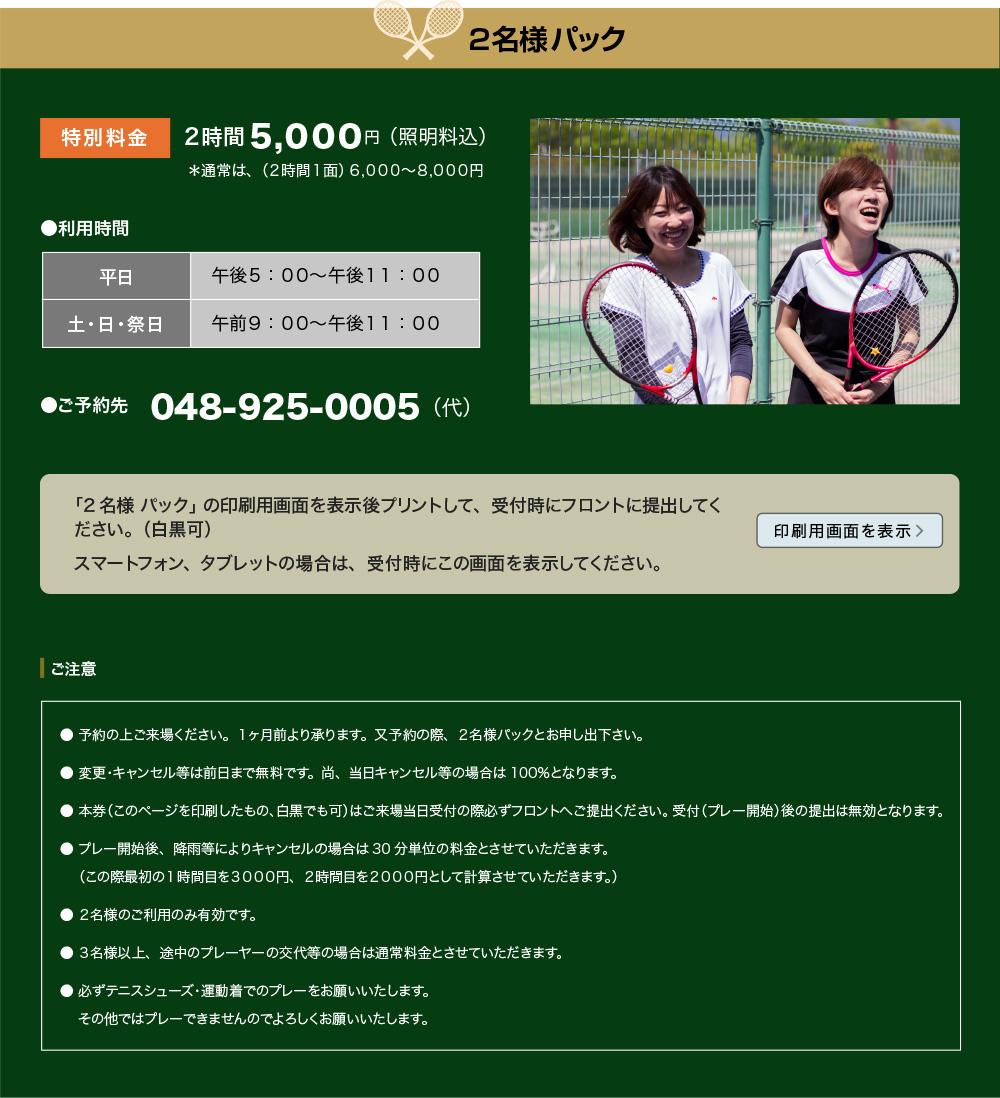 ● 予約の上ご来場ください。1ヶ月前より承ります。又予約の際、2名様パックとお申し出下さい。